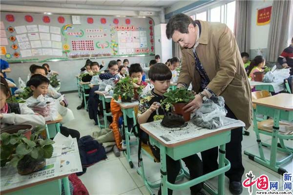 图为崔全胜为学生示范盆栽蔬菜种植方式。受访者供图