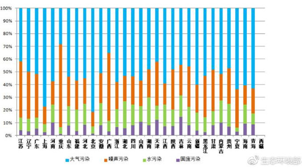 从各省污染类型占比来看,北京、上海的大气污染举报占比超过七成,比全国平均水平高出20个百分点,其中北京主要反映恶臭、异味问题,上海主要反映工业废气问题;重庆、广西噪声污染占比超过五成,高出全国平均水平25个百分点,夜间施工噪声扰民问题突出。