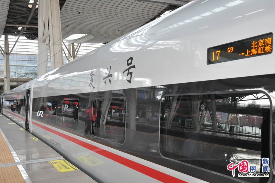 超长版“复兴号”G9次的第17节车厢上写着“北京南至上海虹桥”。中国网记者 唐佳蕾/摄