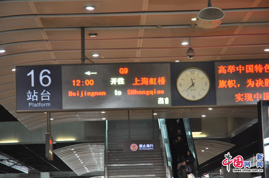 站台显示屏上清楚写着“G9次北京南开往上海虹桥12点发车”。中国网记者 唐佳蕾/摄