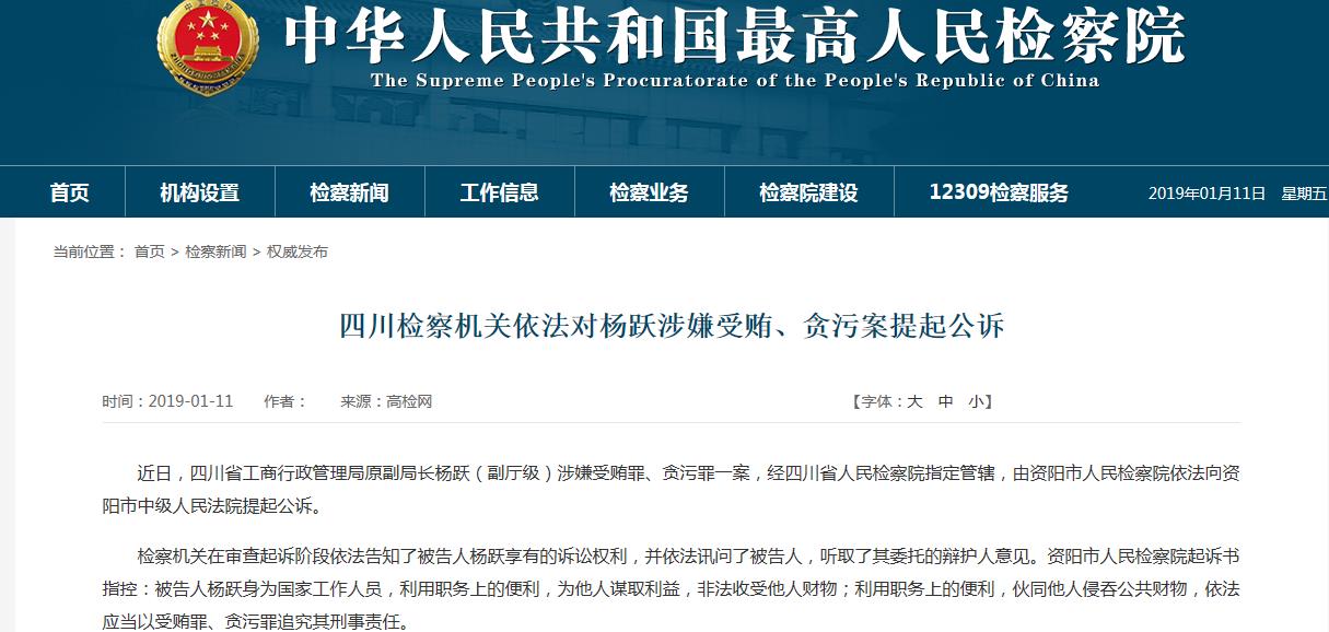 中国网1月11日讯 据最高人民检察院官方网站消息,近日,四川省工商行政管理局原副局长杨跃(副厅级)涉嫌受贿罪、贪污罪一案,经四川省人民检察院指定管辖,由资阳市人民检察院依法向资阳市中级人民法院提起公诉。