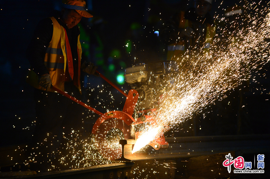 1月15日凌晨,一位施工人员在西安火车站东咽喉区进行联锁设备换装作业。中国网发 唐振江/摄