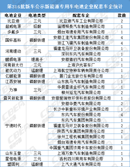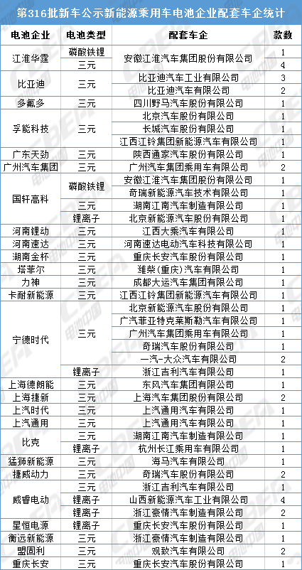 以下是本批新车公示中各类车型配套电池企业分析: