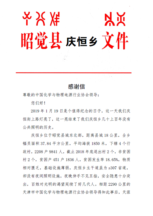 2019年中国化学与物理电源行业协会将继续大力弘扬社会主义核心价值观,大兴友善互助、帮扶相助的社会风尚。协会将携手更多会员单位和相关企业,不仅肩负社会组织和企业的发展职责,更肩负起共同富裕的社会责任,在新能源的发展道路上拼搏前行。今年计划为昭觉县央摩祖乡所在地安装太阳能路灯,也热忱欢迎会员单位和相关企业与我们一道,共同参与凉山彝族扶贫攻坚战,助力彝乡百姓脱贫奔小康。