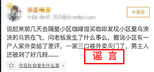 中国网1月29日讯 昨晚有网友发布微博称,自家隔壁小区发生外卖员因获差评杀害一家三口案件,被大量转发。北京市海淀公安分局今日发布情况通报称,网传海淀区发生外卖员因获差评杀人案件不实,警方将对网络造谣者依法进行处理。