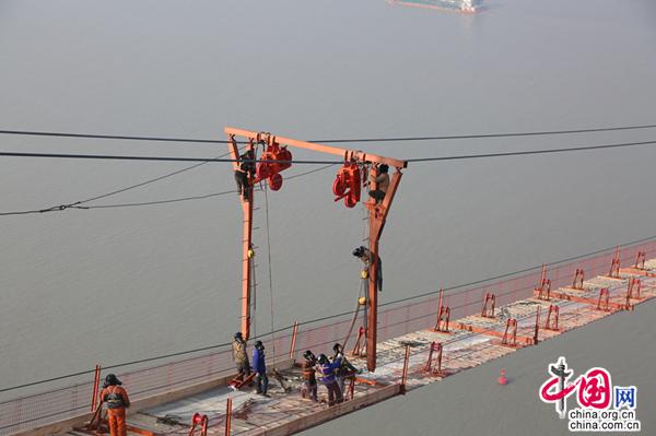 五峰山长江大桥首根主缆索股架设。常美兰 摄