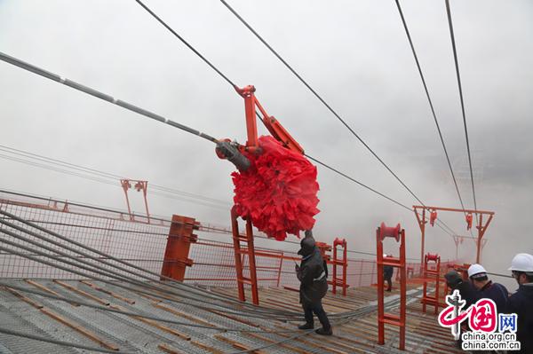 全桥共有2根主缆,上下游各一根,主缆架设采用“预制平行索股法(PPWS)”施工,每根主缆有352根索股组成,每根索股由127丝直径5.5毫米、抗拉强度为1860兆帕的镀锌高强度钢丝组成。每根主缆索股长度约2000米,重约48.7吨。索股又细分为基准索股(编号为1号)与一般索股,猫道和主缆架设牵引系统安装验收完成后,先架设基准索股,基准索股利用绝对高程定位,作为一般索股架设的基准。本次为上游侧首根索股架设,同时也是全桥首根索股架设。