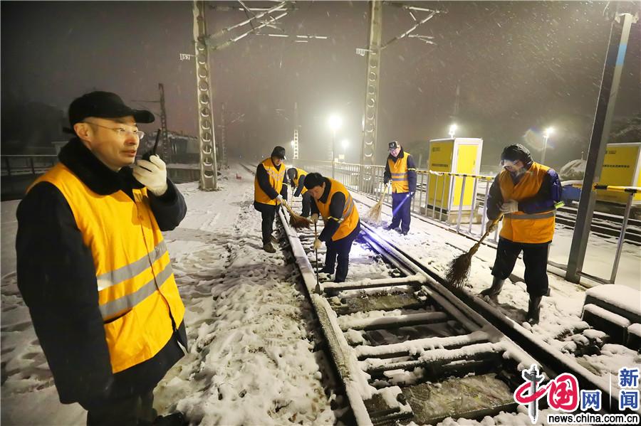 图为1月30日夜晚,该段干部职工正在清除段内整备场道岔上的积雪。中国网发李文伟/摄