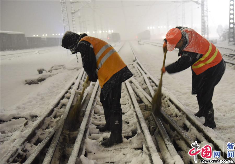 铁路作业人员清扫积雪 中国网发 陆应果/摄