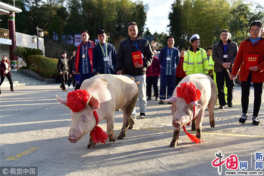 2019年1月31日,广东清远连山金子山举办年终大会,对优秀员工进行表彰。其中最优秀的2名员工,景区奖励2头大年猪给他们。曾令华/视觉中国