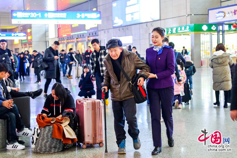 上海虹桥站“心尚”雷锋服务站工作人员帮扶行动不便的老人。王初 摄