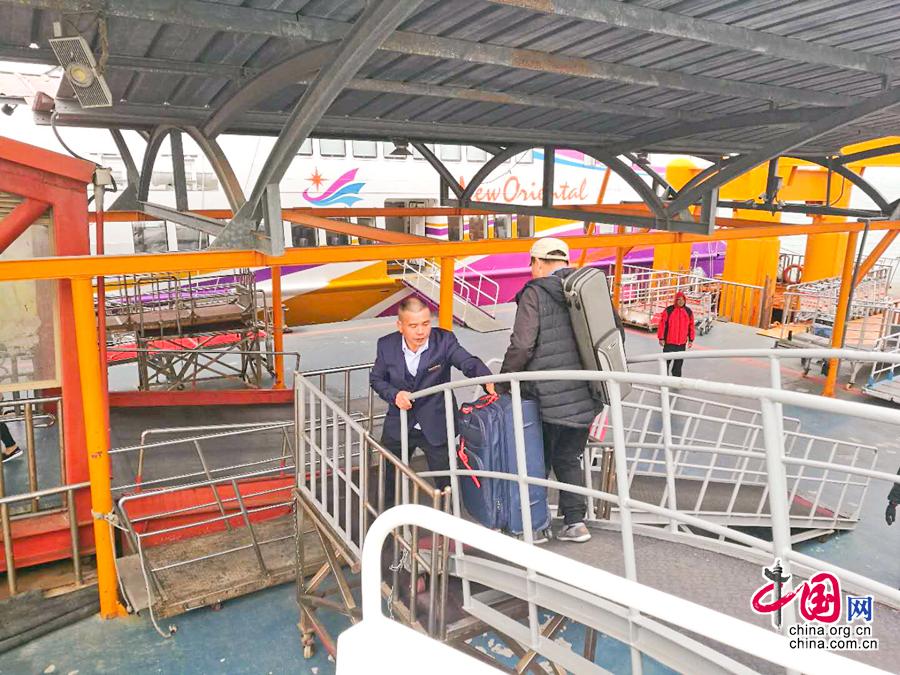 图为和平之星客轮工作人员帮助“小三通”旅客搬运行李。厦门国际邮轮母港集团供图