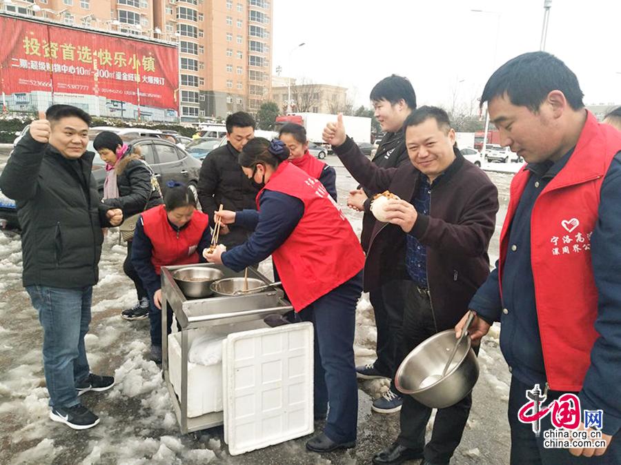 1月31日早晨,河南省交管部门为因降雪被困的车友提供免费的早餐、热水。河南省交通运输厅供图。