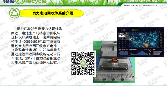 “泰力早在2009年就推出了回收认证体系,已经获得众多企业的认可。”张永祥说。他进一步解释了该体系的操作流程,动力电池在生产时,将泰力回收认证二维码标识印到电池上,客户在电池寿命用尽后,通过标识下单,泰力在接到下单后,通过回收网点回收废弃动力电池。