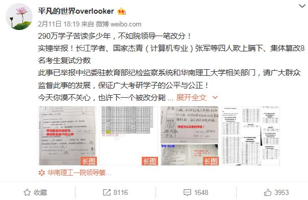 网友举报华南理工大学教师在2018年研究生复试中违规操作微博截图。
