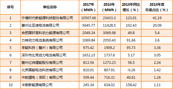 我国动力电池市场发展呈现出乘用车电池配套量增长、高能量密度电池配套增加,行业聚集度进一步提升的特点。根据中国化学与物理电源行业协会动力电池应用分会的数据统计显示,2018年度我国新能源汽车动力电池配套量超过56.89GWh,同比2017年增长56.88%,前20强企业装机量52.23GWh,占全年装机量的91.8%。其中,三元电池30.1GWh,占比58.17%,同比2017年增长103.71%;磷酸铁锂电池22.2GWh,占比39%,同比2017年增长23.51%;锰酸锂电池1.08GWh,占比1.9%,同比2017年减少26.7%;钛酸锂电池0.52GWh,占比0.91%,同比2017年减少8.99%。从各动力类型来看,纯电动汽车配套的动力电池装机量累计约53.01GWh,同比增长55.64%;插电式混合动力汽车配套的动力电池装机量累计约3.82GWh,同比增长75.34%。