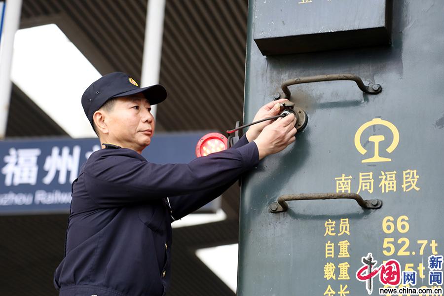 列车始发前在站台上加挂尾部标志灯。 中国网发 王玉星 摄