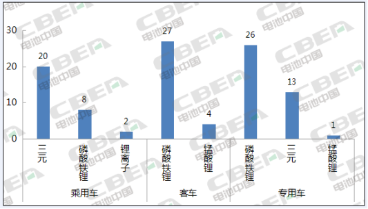 从各车型配套的电池类型来看,乘用车仍以三元电池为主;客车仍以磷酸铁锂电池为主;专用车以磷酸铁锂电池为主,三元电池为辅。