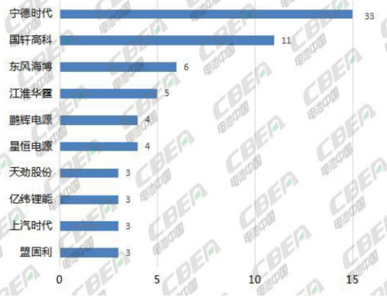 从配套电池企业来看,共有33家企业为101款新能源汽车提供电池配套。其中,配套车型款数在5款及以上的有4家,分别是宁德时代、国轩高科、东风海博、江淮华霆,配套车型数量分别为33款、11款、6款、5款。排名前十的电池企业配套车型数量之和占本批新车公示总车型数量的74.3%。