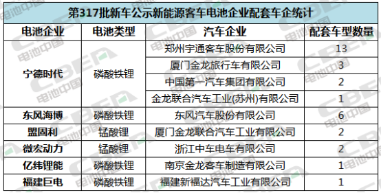 经跟踪数据发现,东风海博的电池在第315批新车公示中首次配套1款东风客车,第316批新车公示中配套10款东风客车,本批新车公示在电池配套中首进前三。