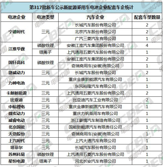 本批公示中共有18家企业为30款新能源乘用车提供电池配套。其中,宁德时代配套车型为5款,,主要配套车企有长城汽车、北京汽车、广汽三菱;江淮华霆也配套5款车型,主要配套车企有江淮汽车、上汽通用五菱汽车,与宁德时代在乘用车配套数量上并列。