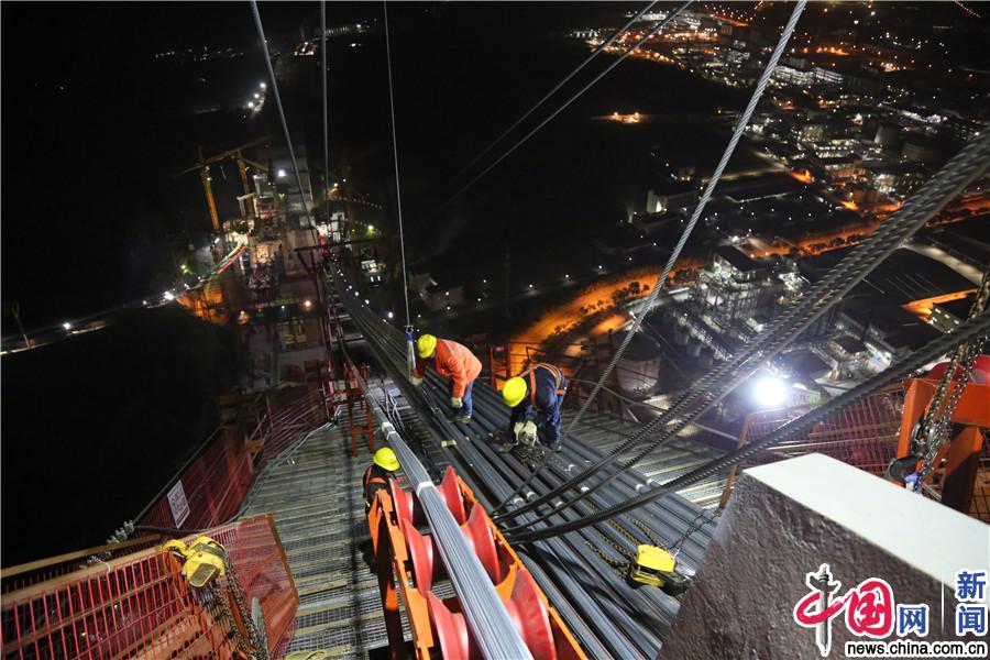 工人正在调整主缆线形。(中国网发 常美兰/摄)