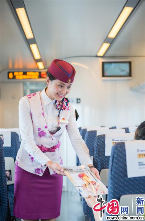 成渝高铁的列车长正在为旅客送动车服务指南。