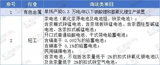 其中,含汞电池,不包括含汞量低于 2%的扣式锌氧化银电池以及含汞量低于 2%的扣式锌空气电池,应于 2021 年 1 月 1 日前淘汰。有淘汰计划的条目,根据计划进行淘汰;未标淘汰期限或淘汰计划的条目为国家产业政策已明令淘汰或立即淘汰。