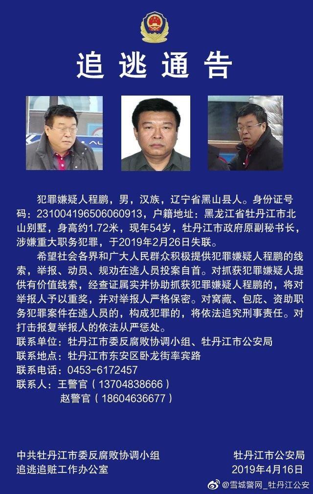 追逃通告显示,犯罪嫌疑人程鹏,男,汉族,辽宁省黑山县人,身份证号码:231004196506060913,户籍地址:黑龙江省牡丹江市北山别墅,身高约1.72米,现年54岁,牡丹江市政府原副秘书长,涉嫌重大职务犯罪,于2019年2月26日失联。