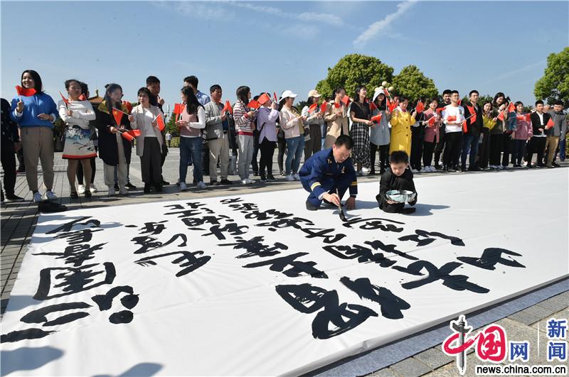毛泽东青年艺术雕像广场上,望城区消防大队教导员邹伟民在12米长、4米宽的书法长卷上开始《沁园春·长沙》诗词书法创作。