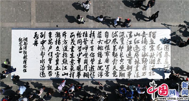 书法功底深厚的邹伟民在游客的欢呼声中完成巨幅书法创作。