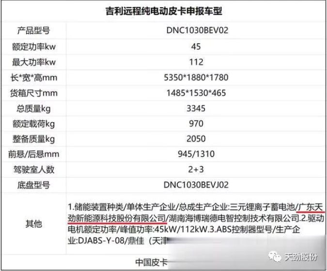 5月17日,第320批《道路机动车辆生产企业及产品公告》通过国家工信部审核,吉利旗下新能源商用车品牌远程的首款纯电动皮卡赫然在列。电池中国网注意到,这款皮卡采用的电池为三元锂离子蓄电池,由广东天劲新能源科技股份有限公司生产。