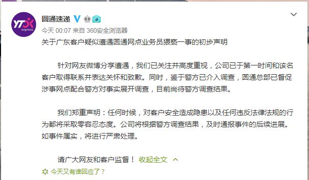 今日凌晨,圆通速递曾通过其官方微博就此事作出过回应,回应称鉴于警方已介入调查,圆通总部已督促涉事网点配合警方对事实展开调查,同时表示,圆通速递任何时候,对客户安全造成隐患以及任何违反法律法规的行为都将采取零容忍态度。