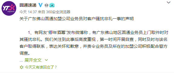在回应中,圆通速递称,网友“卿年酒幂”发布微博称,有广东佛山地区圆通业务员上门取件时对其骚扰非礼。圆通关注到此事后高度重视,第一时间开展自查,同时及时与该名客户取得联系,表达关怀和歉意,并责令业务员及所在的加盟公司积极配合警方调查。