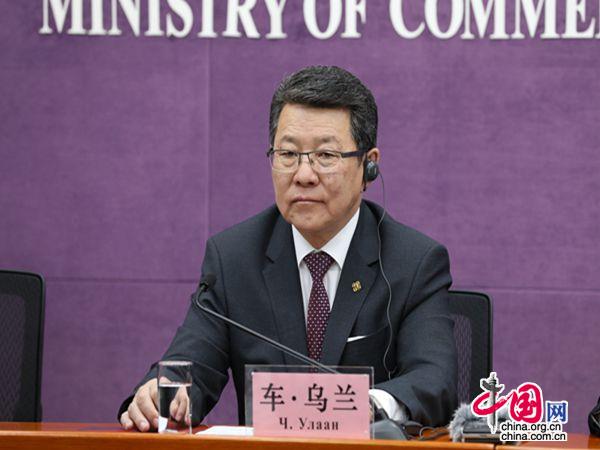 6月3日,商务部举行中蒙经贸关系及第三届中蒙博览会新闻发布会,蒙古国食品农牧业与轻工业部部长乌兰介绍情况。图片来源:商务部