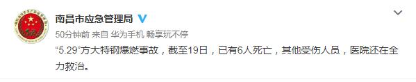 中国网6月19日讯 据南昌市应急管理局官方微博“南昌市应急管理局”消息,截至今日,南昌“5.29”方大特钢爆燃事故已有6人死亡,其他受伤人员,医院还在全力救治。