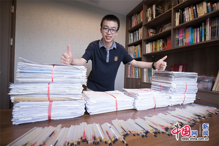 杭州男孩中考夺高分 晒出初中2381份试卷和243支笔芯