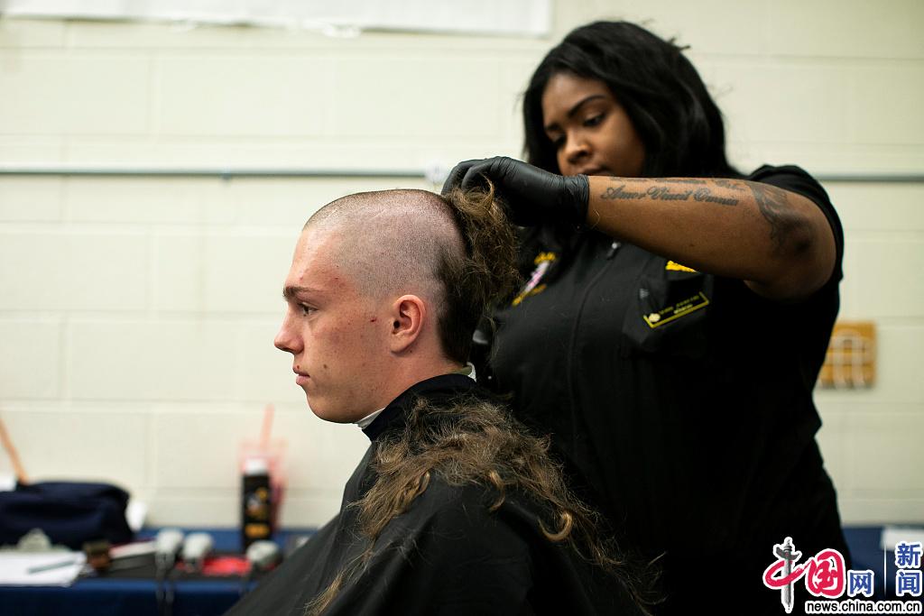 当地时间2019年6月27日,美国安那波利斯,美国海军学院报到日当天,2019级新生们赴学校报到,并进行体检、理发和接受行军礼指导。ALEXANDER DRAGO/视觉中国