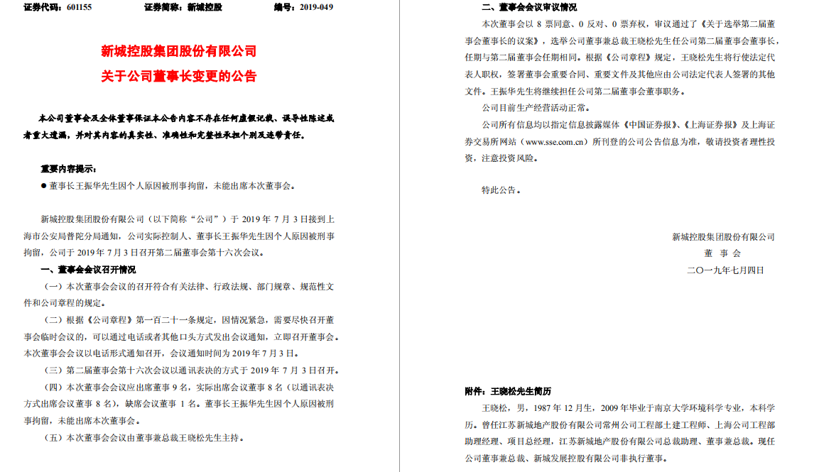 公告称,新城控股于7月3日接到上海市公安局普陀分局通知,公司实际控制人、董事长王振华因个人原因被刑事拘留,随后新城控股召开第二届董事会第十六次会议。选举新城控股董事兼总裁王晓松任新城控股第二届董事会董事长,任期与第二届董事会任期相同。根据《公司章程》规定,王晓松将行使法定代表人职权,签署董事会重要合同、重要文件及其他应由公司法定代表人签署的其他文件。王振华将继续担任公司第二届董事会董事职务。