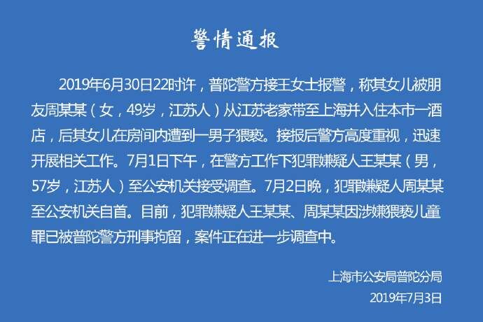 昨日晚间,上海市公安局普陀分局发布通报称,2019年6月30日22时许,上海普陀警方接王女士报警,称其女儿被朋友周某某(女,49岁,江苏人)从江苏老家带至上海并入住本市一酒店,后其女儿在房间内遭到一男子猥亵。接报后警方高度重视,迅速开展相关工作。