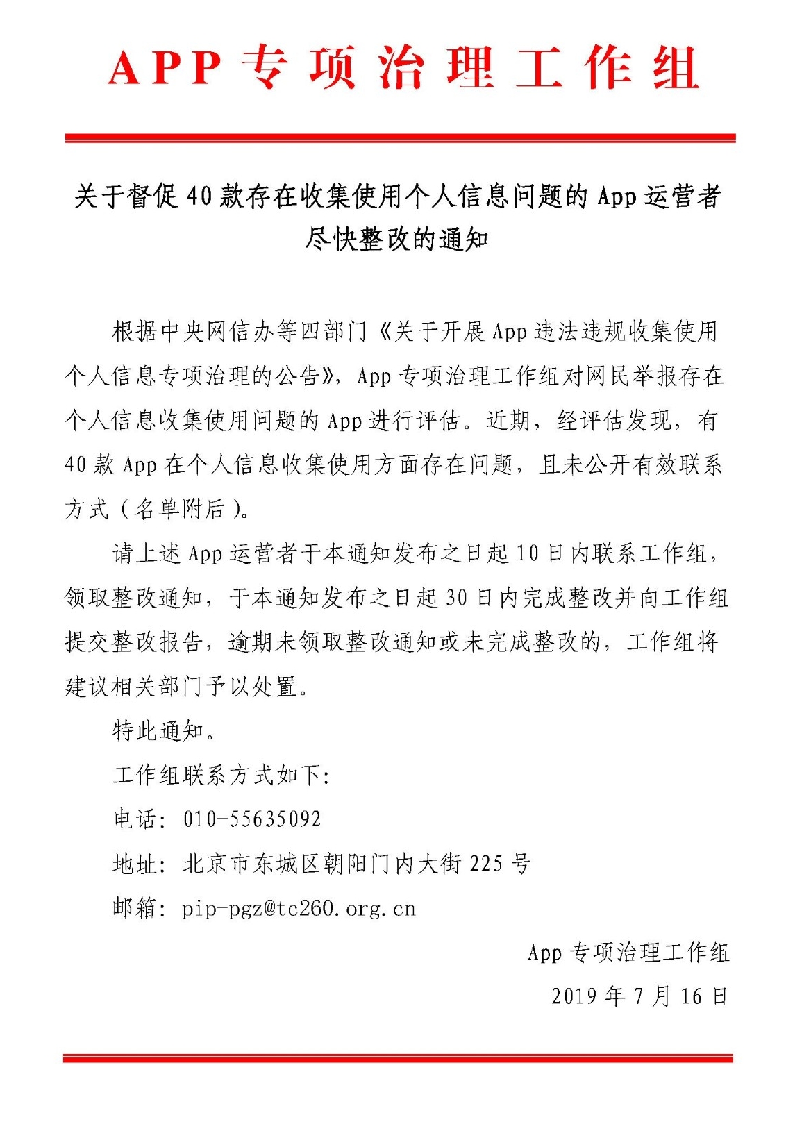 中国网7月17日讯 据中国电子技术标准化研究所官方微信公众号“ App个人信息举报”消息,App专项治理工作组昨日发布了《关于督促40款存在收集使用个人信息问题的App运营者尽快整改的通知》(以下简称:《通知》)。