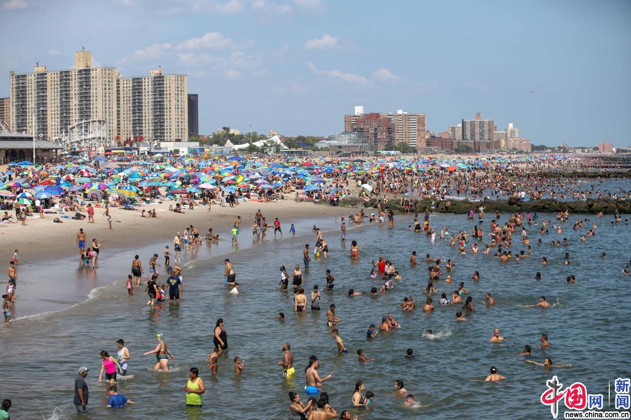 当地时间2019年7月20日,美国纽约,民众在海滩戏水消暑。7月19日到21日,大半个美国进入“烧烤”模式。美国有线电视新闻网21日报道说,从中西部到东部,最高气温高达38摄氏度,加上湿度高,体感温度平均为43摄氏度。据悉,短短三天的高温,已致6人死亡。zuma/IC photo
