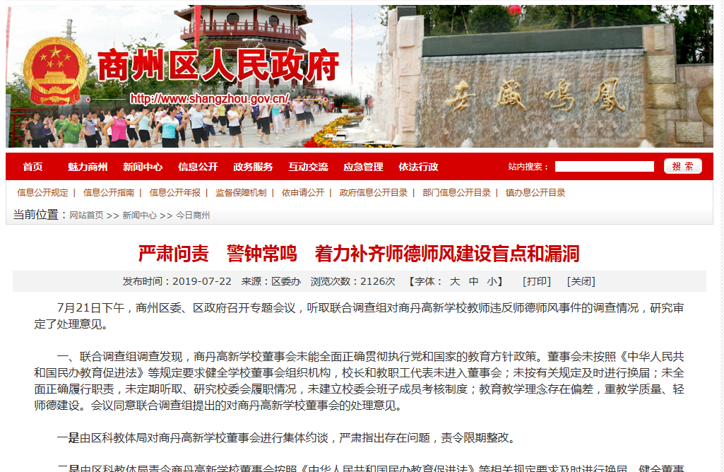 通报称,7月21日下午,商州区委、区政府召开专题会议,听取联合调查组对商丹高新学校教师违反师德师风事件的调查情况,研究审定了处理意见。