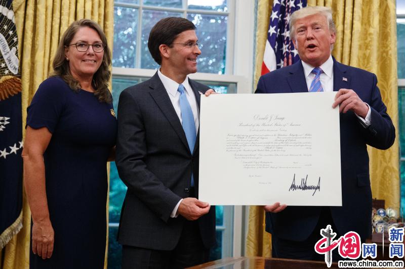 当地时间2019年7月23日,美国华盛顿,马克-埃斯珀宣誓就任美国新国防部长,美国总统特朗普在现场见证。图片来源:IC photo