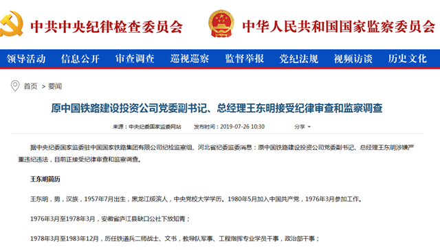 中国网7月26日讯 据中央纪委国家监委驻中国国家铁路集团有限公司纪检监察组、河北省纪委监委消息,原中国铁路建设投资公司党委副书记、总经理王东明涉嫌严重违纪违法,目前正接受纪律审查和监察调查。