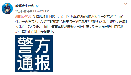 中国网7月26日讯 据成都金牛公安官方微博消息,今日上午11时48分,成都金牛区沙西线华侨城附近发生一起交通肇事案件。一辆银灰色轿车与一辆电瓶车及附近行人发生碰撞,造成1人死亡、7人受伤。目前,肇事车辆及嫌疑人已被挡住并抓获,受伤人员已送往医院救治,案件正在进一步调查中。