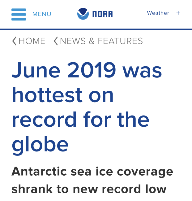 中国网7月29日讯 据美国国家海洋和大气管理局(NOAA)官网消息,2019年6月成为全球有史以来最热的6月,南极海冰面积也在该月达到新低。