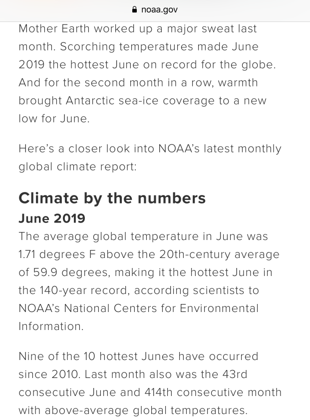 NOAA国家环境信息中心(NOAA's National Centers for Environmental information)数据显示,2019年6月的平均气温比20世纪全球平均气温(15.5摄氏度)高出0.95摄氏度,使得该月成为140年以来最热6月。此外,10个最热6月有9个都出现在2010年以后,其中2019年6月也是连续高于全球平均气温的第43个6月。