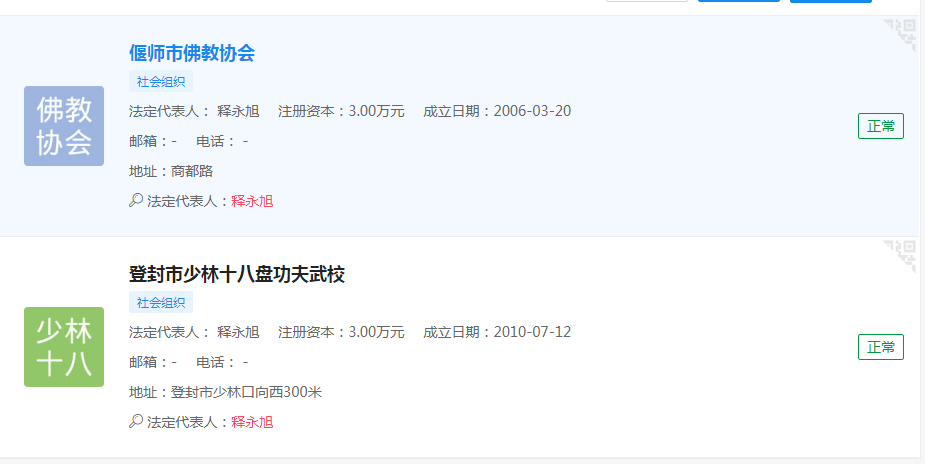 据查询公开资料显示,偃师市佛教协会、登封市少林十八盘功夫武校其法人代表均为释永旭。