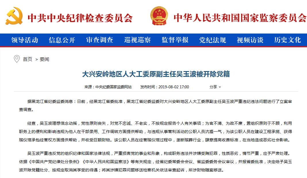 中国网8月2日讯 据黑龙江省纪委监委消息:日前,经黑龙江省委批准,黑龙江省纪委监委对大兴安岭地区人大工委原副主任吴玉波严重违纪违法问题进行了立案审查调查。